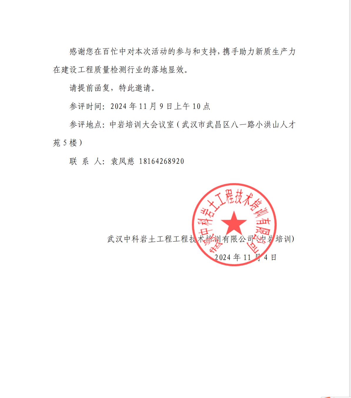 公司總經(jīng)理何宏偉受武漢中科巖土工程工程技術(shù)培訓(xùn)有限公司(中巖培訓(xùn))邀請,于11月9日對“工程質(zhì)量檢測行業(yè)創(chuàng)新成果征集活動”作為嘉賓對參選作品給予評價。