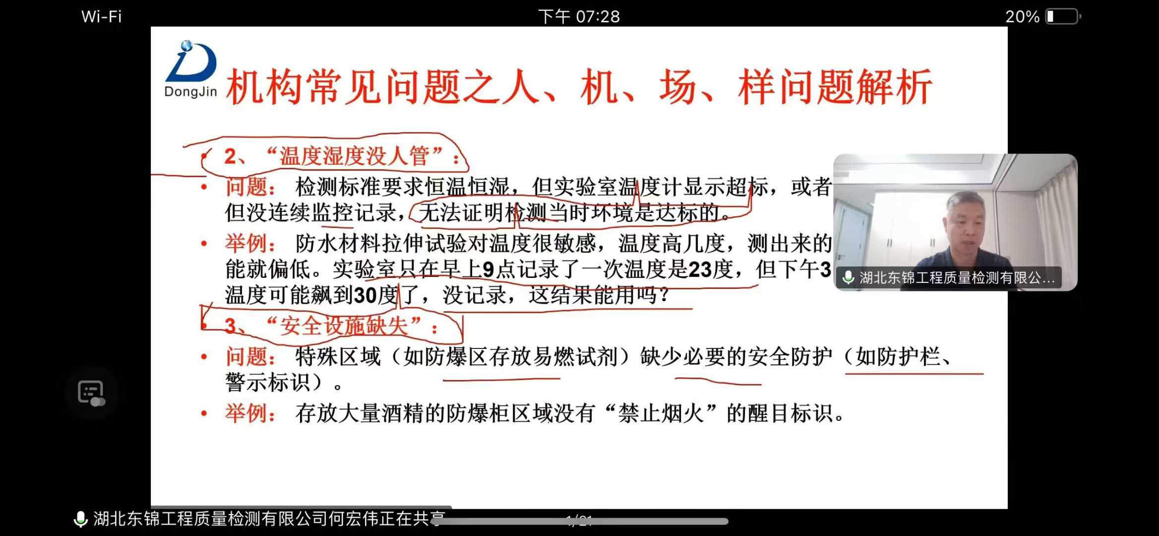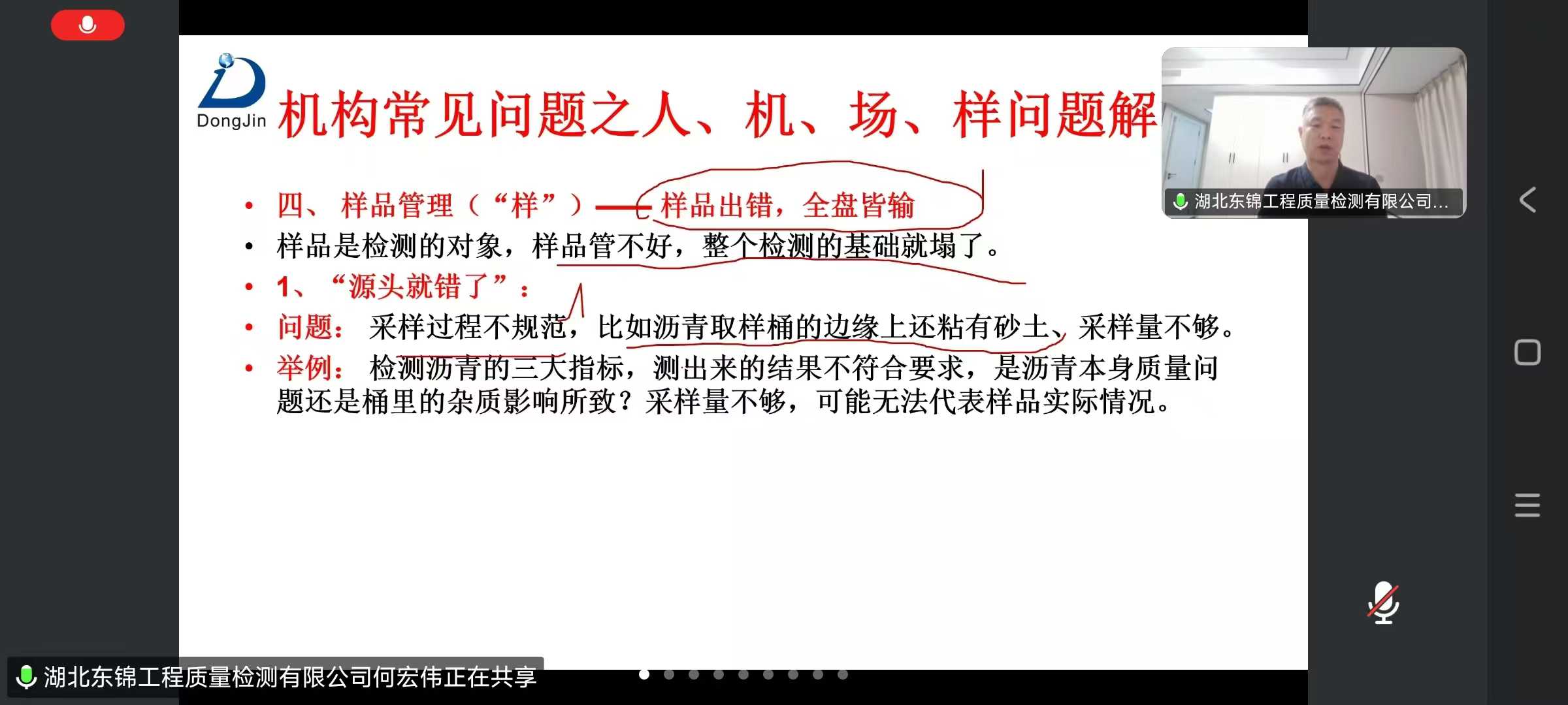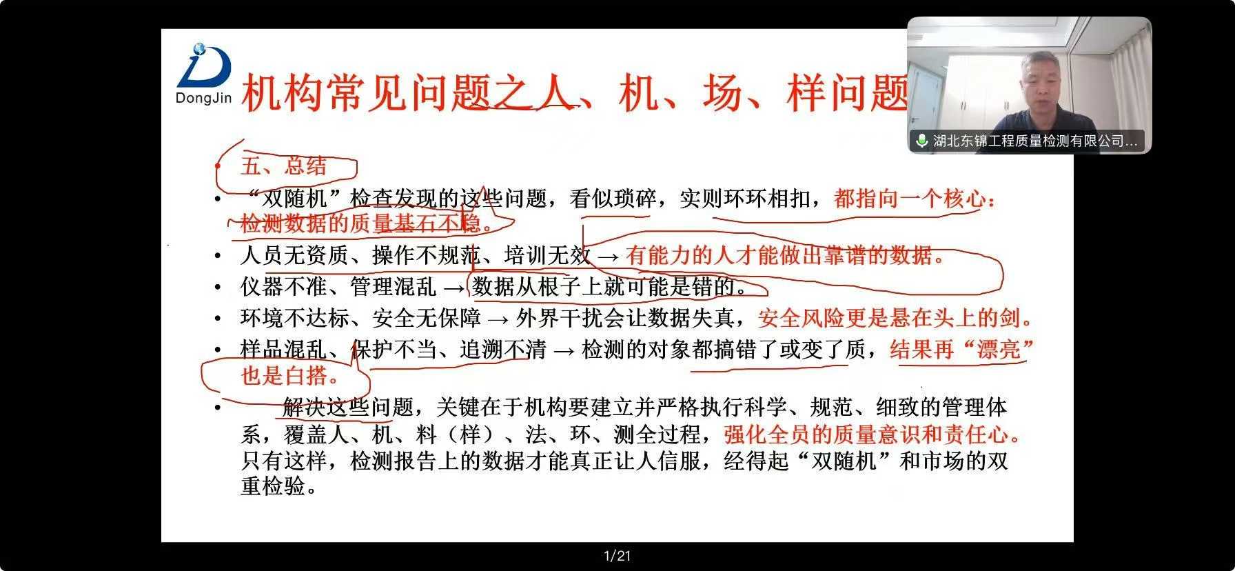 閱讀次數(shù):283 發(fā)布時間:2025年09月24日2025年9月23日19:00,公司總經(jīng)理何宏偉在線上為全體員工進行《檢測機構(gòu)“雙隨機”檢查常見問題之人、機、場、樣問題解析》培訓(xùn)。此次培訓(xùn)為確保”質(zhì)量月”系列活動取得實效,教育大家別把習(xí)慣當成標準、要把標準變成習(xí)慣。