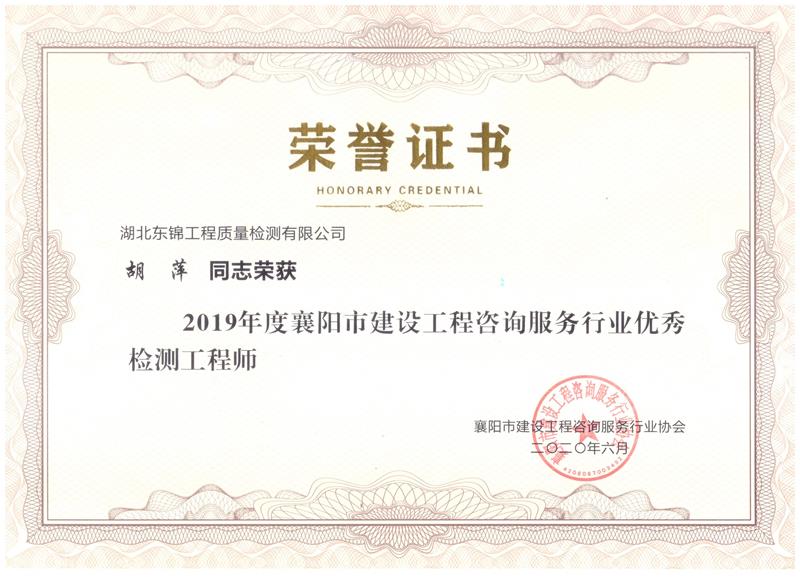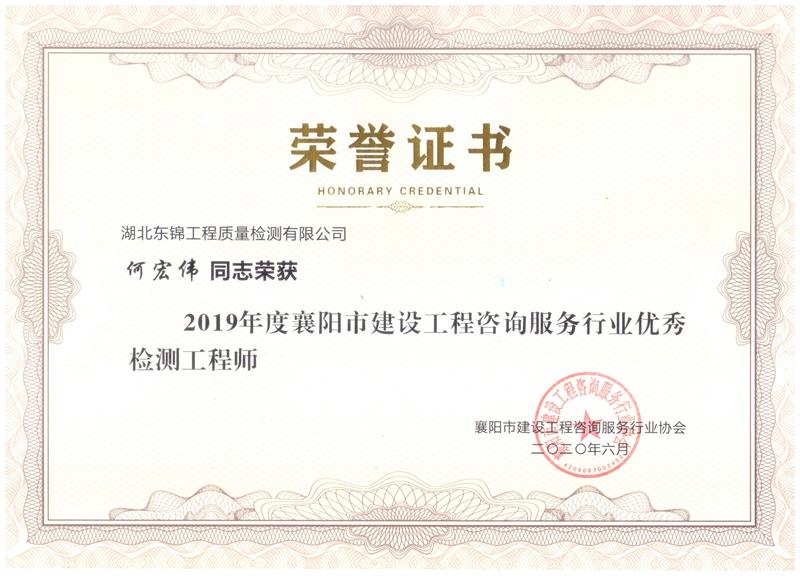 閱讀次數(shù):1654 發(fā)布時間:2020年07月03日東錦檢測公司被襄陽市建設(shè)工程咨詢服務(wù)行業(yè)協(xié)會評為先進單位。公司總經(jīng)理兼技術(shù)負責人何宏偉、公司總工程師兼質(zhì)量保證人被評為優(yōu)秀檢測工程師