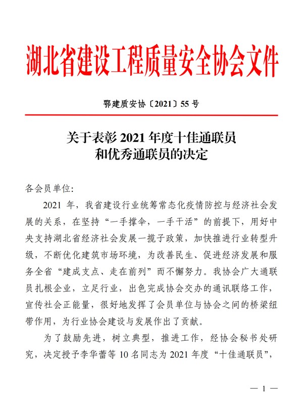 鄂建質(zhì)安協(xié)〔2021〕 55號:表彰通聯(lián)員通知