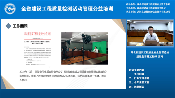 5月29日下午2:30,線上公益培訓(xùn)開始,武漢富思特創(chuàng)新信息技術(shù)有限公司總經(jīng)理謝玉超對新版湖北省建設(shè)工程質(zhì)量檢測監(jiān)管系統(tǒng)功能進行詳細介紹,新版湖北省建設(shè)工程質(zhì)量檢測監(jiān)管系統(tǒng)運用數(shù)字化手段和AI技術(shù),實現(xiàn)對檢測資質(zhì)和檢測活動的動態(tài)化、精準(zhǔn)化監(jiān)管,構(gòu)建了待辦中心、預(yù)警中心、決策中心三大核心功能模塊,實時監(jiān)測異常情況,并向監(jiān)管部門推送預(yù)警信息,助力各級監(jiān)管人員高效履職。系統(tǒng)還創(chuàng)新引入信用監(jiān)管機制,結(jié)合檢測機構(gòu)及從業(yè)人員的信用評價,實施差異化監(jiān)管,推動行業(yè)自律。 省質(zhì)安總站質(zhì)監(jiān)科工程師雷鳴對湖北省建設(shè)工程質(zhì)量檢測行業(yè)管理工作進行了回顧,介紹了以后一段時期要開展的主要工作及工作思路,比如:落實分類監(jiān)管、對墻體保溫材料整治與住建部住宅工程常見問題重點整治、修訂地標(biāo)《房屋市政工程質(zhì)量檢測項目分類規(guī)范》,通過提高市場行為、技術(shù)行為從而提高行業(yè)管理標(biāo)準(zhǔn)化水平、探索數(shù)智賦能和開展行業(yè)調(diào)研等工作,最后,對前期征集的大家關(guān)注的特別是新舊資質(zhì)過渡期間存在的相關(guān)問題進行答疑,并呼吁檢測機構(gòu)堅持初心,切實履行好為工程質(zhì)量保駕護航的使命。 這次培訓(xùn)對于全省監(jiān)督機構(gòu)、檢測機構(gòu)平穩(wěn)完成新舊資質(zhì)過渡、規(guī)范檢測行為、在新資質(zhì)標(biāo)準(zhǔn)下推動行業(yè)發(fā)展具有很強的指導(dǎo)作用。全省建設(shè)工程質(zhì)量監(jiān)督人員、檢測機構(gòu)相關(guān)人員計 7600人參加了本次培訓(xùn)。 此次培訓(xùn)由武漢富思特創(chuàng)新信息技術(shù)有限公司承辦。